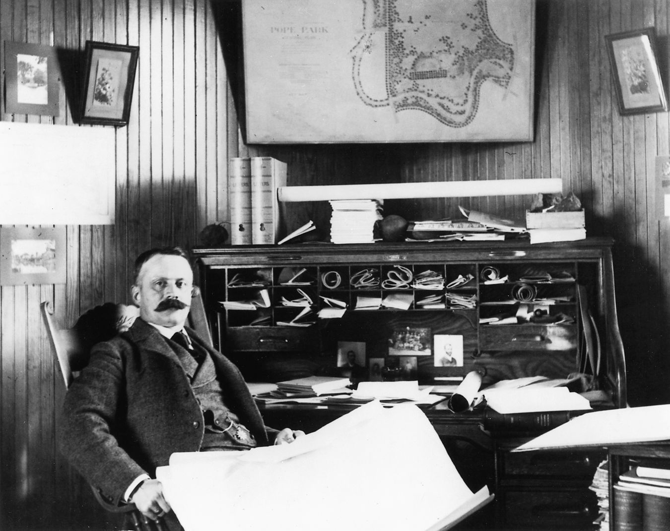 Theodore Wirth at his desk in early 1900s. Location unknown. The map on the wall behind his desk is of a park in Hartford, Connecticut, where Wirth was employed before he came to Minneapolis in 1906. (Courtesy Minneapolis Park and Recreation Board.)
