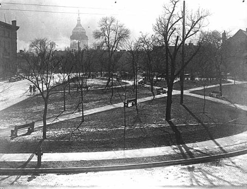 Wilson Park, once known as Hawthorne Park, in about 1942, looking southwest with Basilica in background (Jack Delano, Minnesota Historical Society)