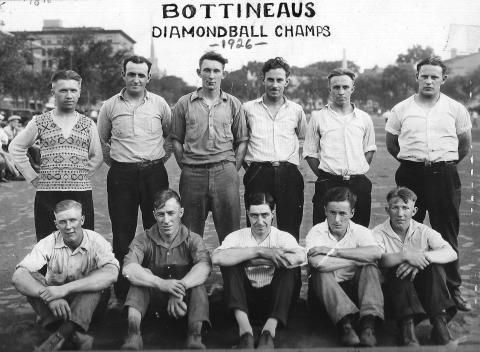 Bottineaus, Minneapolis diamondball champs, 1926, one of their last championships together. Front row (l-r): Carl Pearson, Tubby Burns, Haloran, George Besnah, Zig Bishop. Back row: Charlie Cells, Mgr., Pat Long, Boney Selinsky, Bloom Brothers, Swede Wilson. Manager Charlie Cells kept the scrapbook from which all of the “Bottineaus” pictures were copied. (Minneapolis Park and Recreation Board)