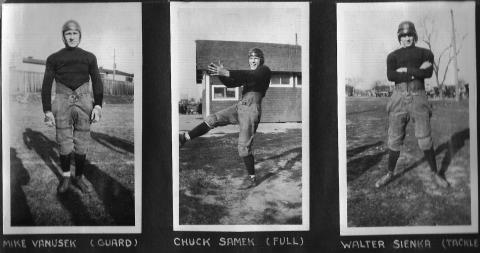 Bottineau football players, 1925. Mike Vanusek (guard), Chuck Samek (full), the hero of the 1926 game, and Walter Sienka (tackle). The building behind Samek is the Bottineau Field shelter that served the park 1916-1956. The original shelter did not have bathrooms. The park board moved two toilets from Loring Park to Bottineau in 1918. There is no record that indoor plumbing was added to this shelter before it was replaced in 1956. Does anyone remember toilets at the old Bottineau Field shelter? (Minneapolis Park and Recreation Board)
