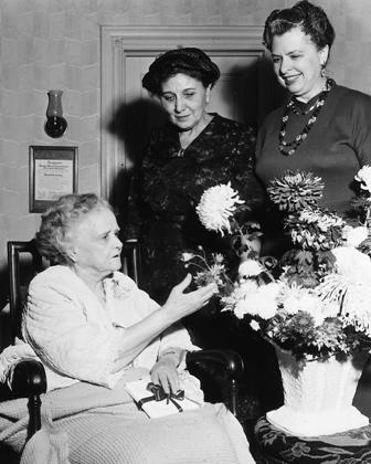 Maude Armatage was given flowers on her 90th birthday in 1960 by park commissioners Inez Crimmins and Lorna Phillips (Minneapolis Park and Recreation Board)