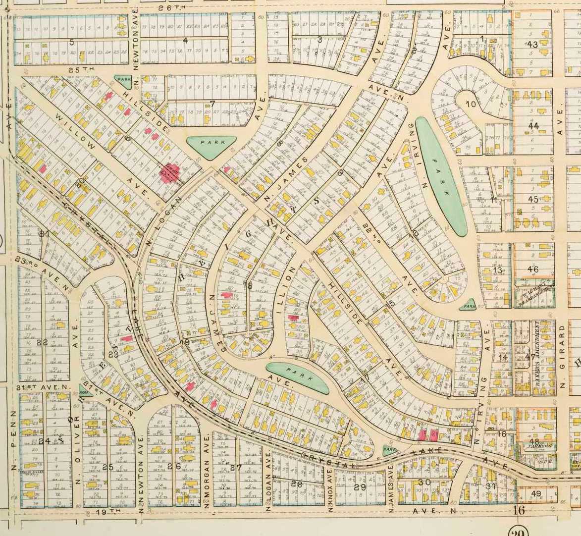 Forest Heights, platted in 1883. Glen Gale park is at Irving and 23rd. 1892 plat map. (John R. Borchert Map Library, University of Minnesota)