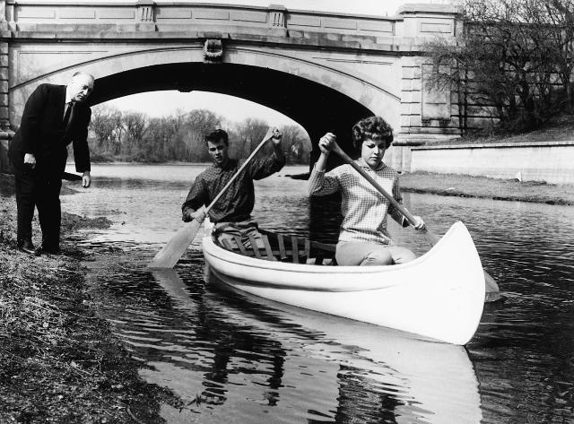 Park superintendent Howard Moore helps launch a canoe in 1960 to celebrate navigable water once again after a few years of a dry channel between Lake of the Isles and Lake Calhoun. (Minneapolis Park and Recreation Board)