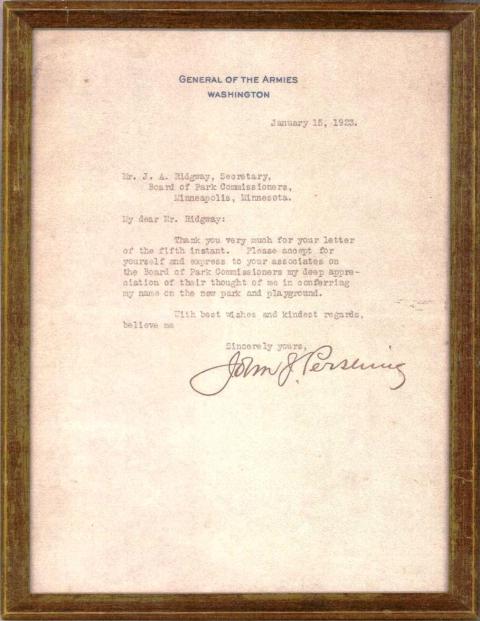 After the park board named a new park and playground in southwest Minneapolis, Pershing Field, December 5, 1922, it received a thank you note from the man it was named for—Gen. John J. Pershing.