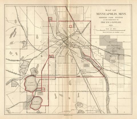 When the Minneapolis park board was created in 1883, the new board asked Chicago-based landscape architect Horace William Shaler Cleveland for his advice on creating parks in the city. He presented a comprehensive blueprint, “Suggestions for a System of Parks and Parkways for the City of Minneapolis,” which gave the highest priority to making a park of the Mississippi River gorge below the falls:
