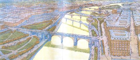 Bennett’s final plan was completed in early 1912 and was publicly displayed along with Jules Guerin’s illustrations in the McKnight Building downtown in May 1912. Bennett called the riverfront the “Greatest of Great Opportunities” for Minneapolis, but really devoted little space to the river banks. He was more concerned with prettier, more “monumental” bridges over the river than what was done on the banks.