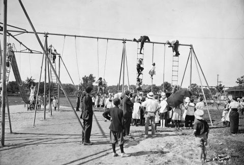 North Commons playground about 1910. Have you ever seen a taller slide? Are you impressed by the liitle girl in a dress climbing the pole? (Minnesota Historical Society