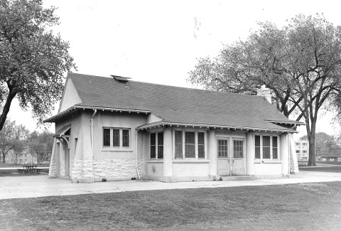 The recreation shelter at Van Cleve Park in Minneapolis facing an artificial pond