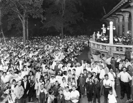 A community sing at Logan Park. The band performed from the partially covered veranda of the field house. (City of Parks, Minneapolis Park and Recreation Board.)