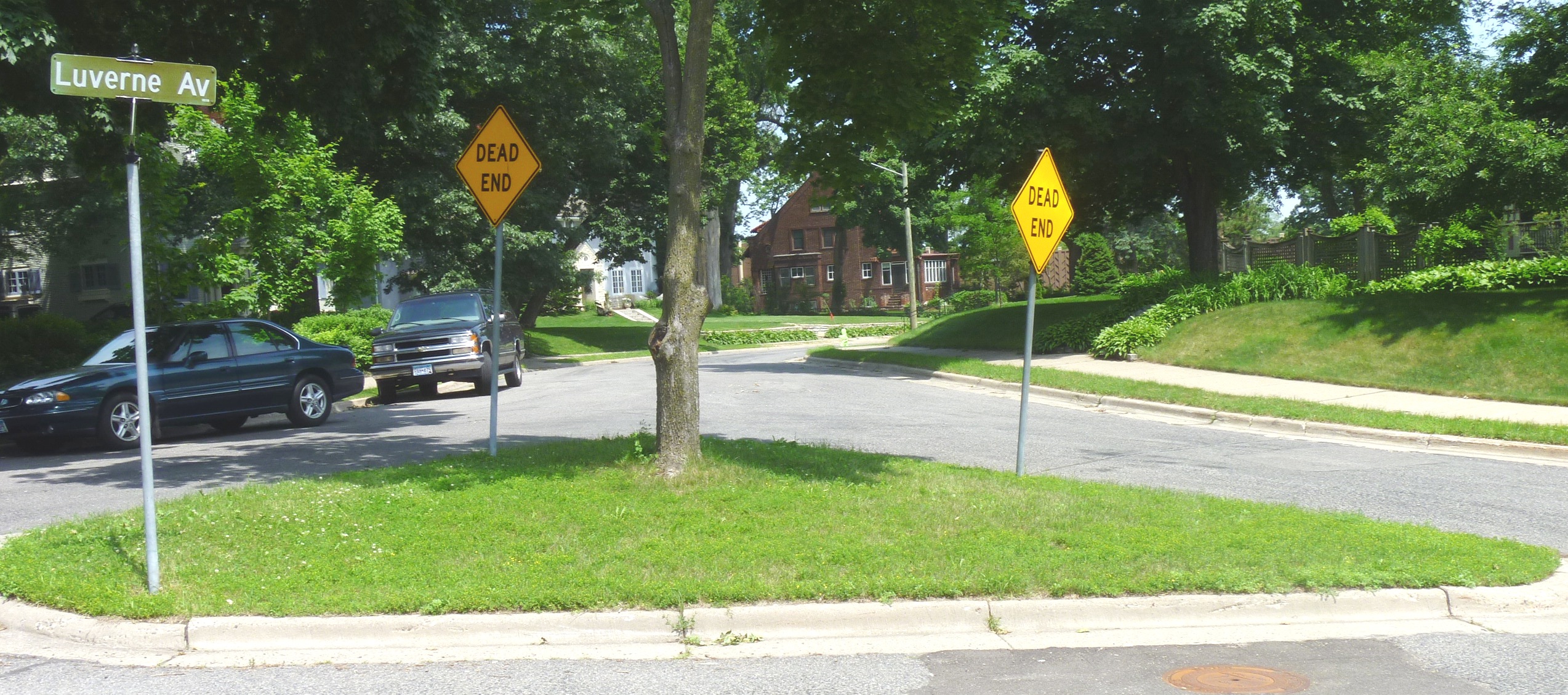The second smallest is Elmwood Triangle at Luverne and Elmwood just north of Minnehaha Creek near Nicollet. Basic grass and tree — and two dead end signs. Seems a bit ominous.