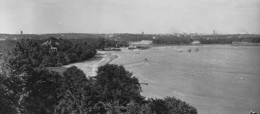 Lake Calhoun’s northwest shore and Bath House in late 1910s. Photo taken from Minikahda Club. Click to enlarge. (Minneapolis Park and Recreation Board)