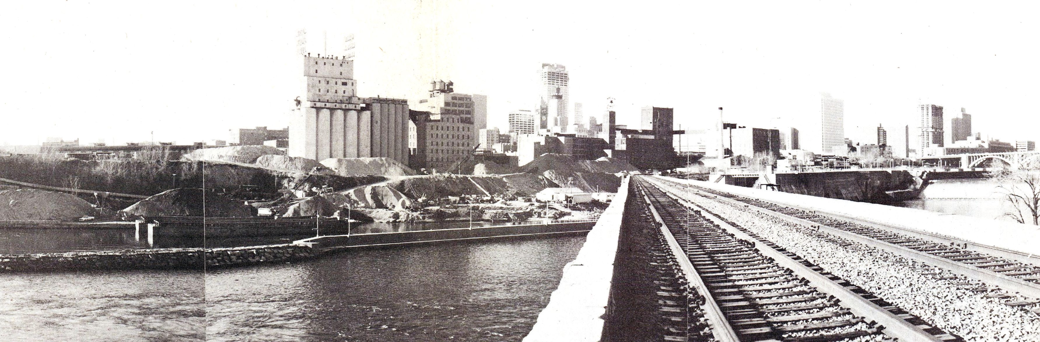The piles of sand and aggregate in front of the old mills were used to make concrete and were owned by Shiely Co. The materials were mixed on site and used in downtown construction projects; the sand and gravel could be transported at much lower cost by barge than by truck. The company first used the area for aggregate storage when it was making the concrete to build the upper lock and dam — on the right of the bridge — which was completed in 1965. Train traffic on the Stone Arch Bridge had stopped a couple of years before this photo was taken.