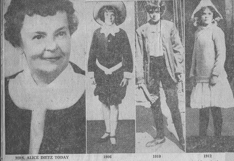 Alice Dietz in 1957 near the time of her retirement and as a child actor, from an undated newspaper clip.