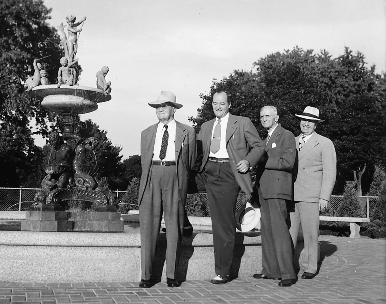 The dedication of Heffelfinger Fountain in Lyndale Park, 1947. This is the only photo I’ve seen of Theodore Wirth and Francis Gross together. They are joined by an even better-known Minneapolitan. From left: Park Superintendent Emeritus Theodore Wirth, Minneapolis Mayor Hubert H. Humphrey, Park Board President Francis A. Gross, Park Superintendent Charles E. Doell. Wirth was then 84 and Gross 77. The fountain had been discovered and purchased in Italy by Frank Heffelfinger, shipped to Minneapolis, and given to the park board. (Minneapolis Park and Recreation Board)