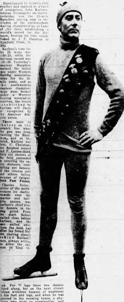But it was John Karlsen who was the champion marathon skater. And he was remembered for it, even in Oklahoma 20 years after breaking the world 25-mile record on a freezing Sunday afternoon on Lake of the Isles.