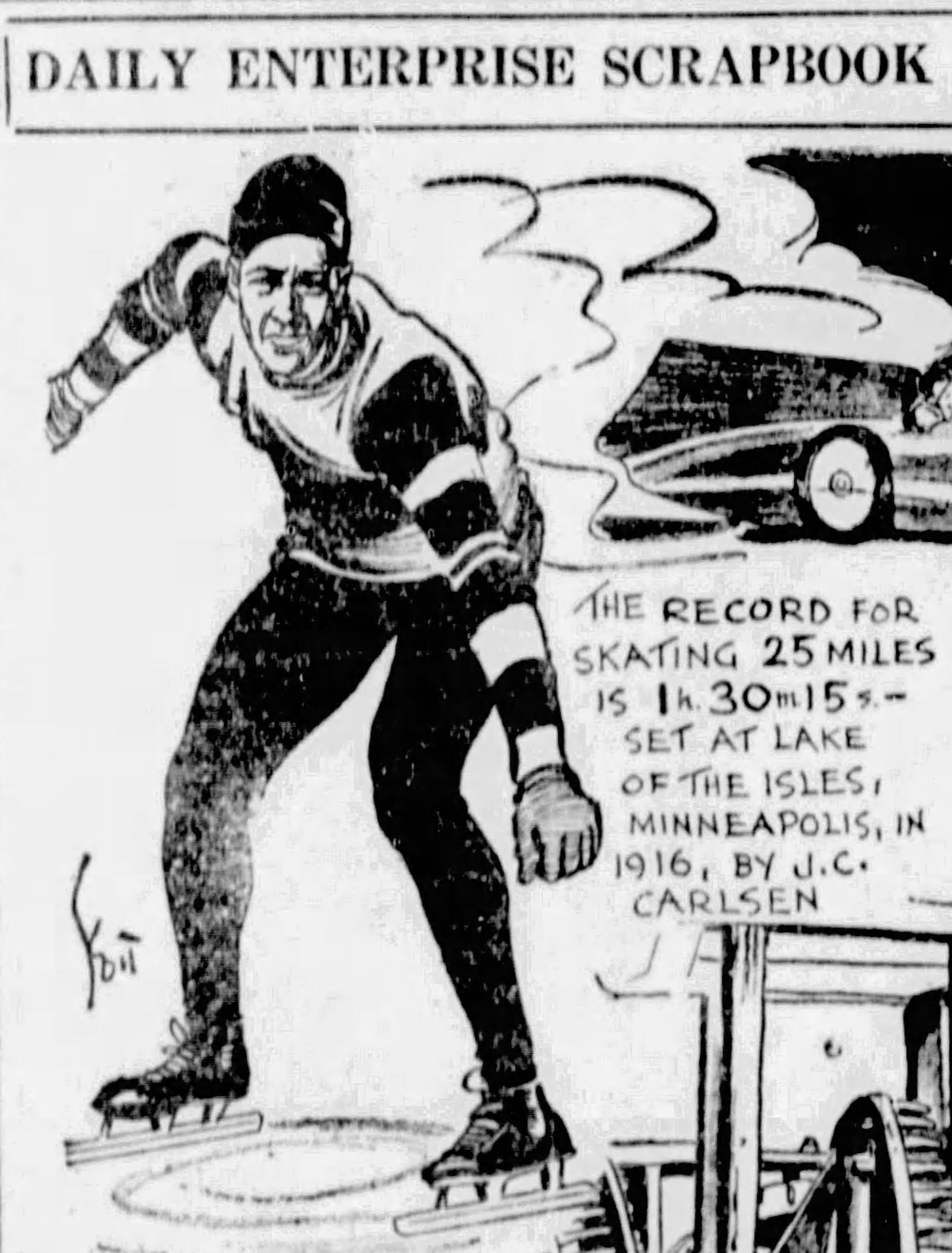 But it was John Karlsen who was the champion marathon skater. And he was remembered for it, even in Oklahoma 20 years after breaking the world 25-mile record on a freezing Sunday afternoon on Lake of the Isles.