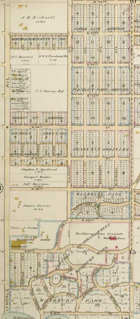 H. W. S. Cleveland is listed as the owner of 4.7 acres on West 44th Street between Pleasant and Harriet in the upper left corner of this section of an 1892 plat map of Minneapolis. (John R. Borchert Map Library, University of Minnesota. Go to http://map.lib.umn.edu/collections/digitizedplatbooks/minn1892index.htm for the complete map.)