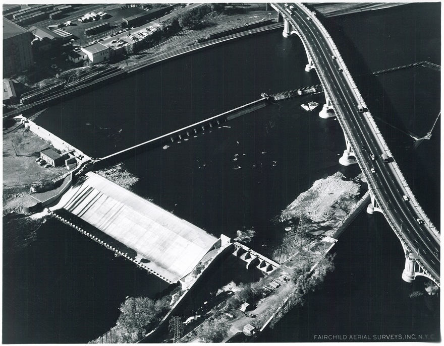 The concrete apron at St. Anthony Falls is bone dry in 1955. The 3rd Avenue Bridge crosses the photo. Dry land — even a small structure — left (west) of the falls stand where the entrance to the lock is now. (Fairchild Aerial Surveys, Minneapolis Park and Recreation Board)