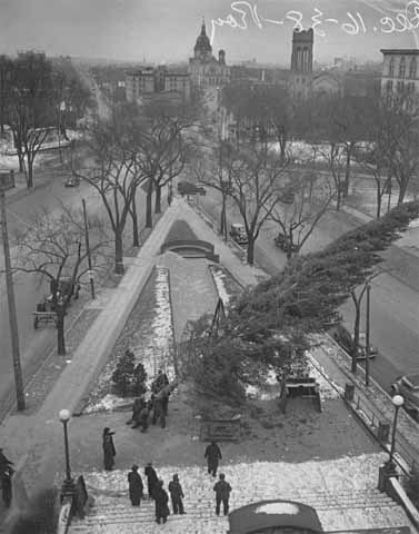 Isn’t this view lovely compared to the freeway interchanges, tunnels, etc. of today? The park board put up and decorated a huge Christmas tree in the triangle each year. I don’t know when that practice began or ended, but I’ll try to find out. If you know, send me a note.