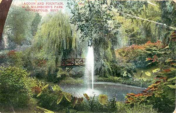 “W. D. Washburn’s Park”, meaning the grounds at Fair Oaks, looking like a tropical garden — and with a different bridge — about 1910 (Minnesota Historical Society)